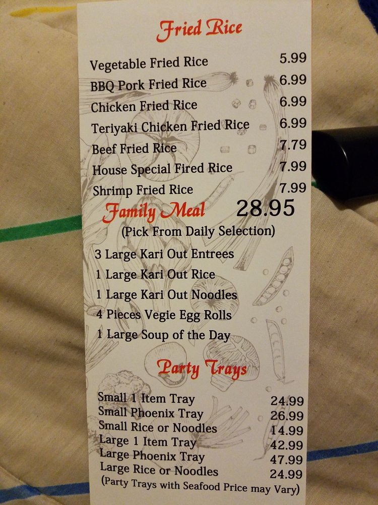 3 large kari out entree, 1 large kari out rice, 1 large kari out noodles.